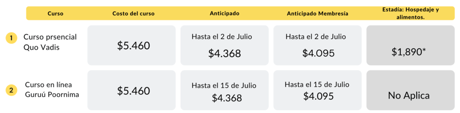 ***El pago a El Arte de Vivir puede ser por medio de transferencia electrónica, efectivo o tarjeta de crédito. El pago completo del curso debe de realizarse al menos 8 días antes del inicio del curso.